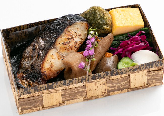 幻のコシヒカリと言われる雪ほたかを土鍋で炊き上げた香り、照り、甘みのそろったご飯に、瀬戸内産一番摘み海苔、おかかを乗せたシンプルながらこだわりの海苔弁。おかずはとろける様に脂ののった銀鱈を自家製の西京みそだれでつけこんだ西京焼きを使用。みその甘味とコク、銀鱈の上品なのうまみが調和したお弁当になっています。