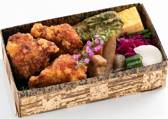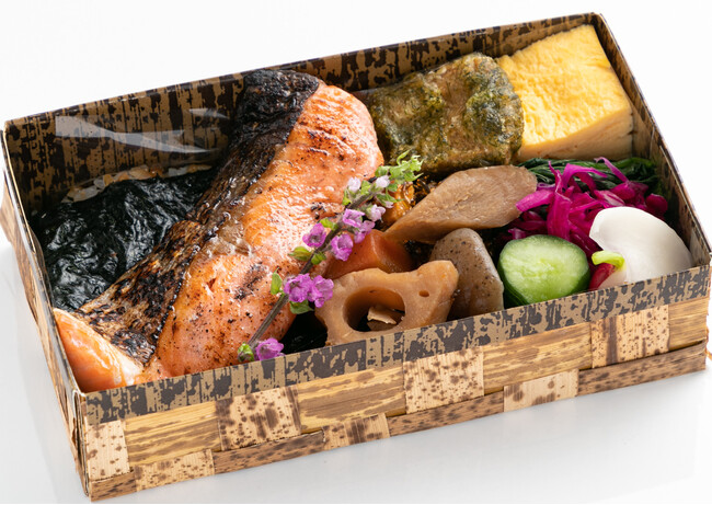 天皇献上米、幻のコシヒカリ「雪ほたか」を美味しくお召し上がりいただけるSALON GINZA SABOUのお弁当。メインのおかずには日本の食文化の定番「銀鮭の塩焼き」「唐揚げ」「銀鱈西京焼き」をラインアップし、一品ずつ丁寧に出汁を取り、下処理を行うことで素材の旨みを引き出しています。調味料に使用する糖分は白砂糖を抑え、羅漢果からとれる甘味成分を20%使用することでカロリーと糖質を抑え通常よりもヘルシーに仕上げています。