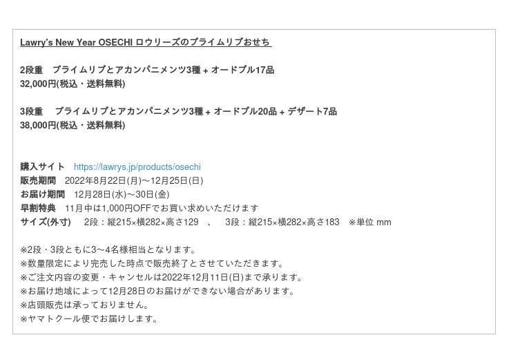 ロウリーズでは、昨年に引き続き全国配送可能な通販おせち『Lawry's New Year OSECHI』をオンライン販売しています。現在、10月末まで早期特典として2,500円割引を実施中です。そして早期特典第2弾として、11月は1,000円割引で提供します。お食事がメインの2段重、キャビアやトリュフバター等も楽しめる3段重の2種類をご用意しています。今年は昨年以上の受注数を目指し、日頃からロウリーズの実店舗を利用いただいているお客様のみならず、ロウリーズを利用されたことのない方まで、幅広い方々に同おせちをご利用いただき、ロウリーズを知っていただくきっかけとなることを期待しています。