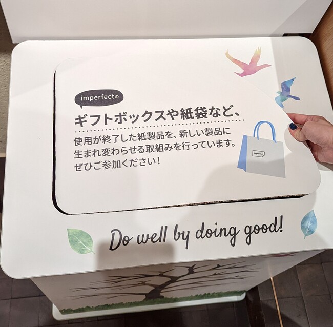 imperfect店舗では、マイボトルのご利用推進等、資源の有効活用及び使用量削減に配慮しておりますが、店舗にて有意義なお時間をお過ごしいただく際の商品ご提供、プレゼントでの商品のお渡し等に際して、包装紙やギフトボックス、ショッパー等で紙製品を使用しています。