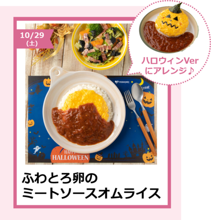 10/24号では子どもに人気なメニューを取り揃えました。中でも注目メニューは、子どもが喜ぶハロウィンバージョンにアレンジした10/29(土)の「ふわとろ卵のミートソースオムライス」。ハロウィン仕様のランチョンマットもメニューブック『すまいるごはん』に付属しています。ヨシケイのイベントメニューは、子どもと一緒でも簡単に作ることができるよう開発。食育にもなるということで、多くの好評を得ています。