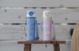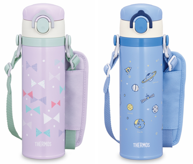 カラーは、リボンとドットが可愛らしいパステルパープルと、ロケットや惑星など宇宙をイメージしたサックスブルーの2種をご用意。ボトル本体にお名前が書けるスペースをデザインしており、新入園・新入学の時期に揃えたいアイテムです。