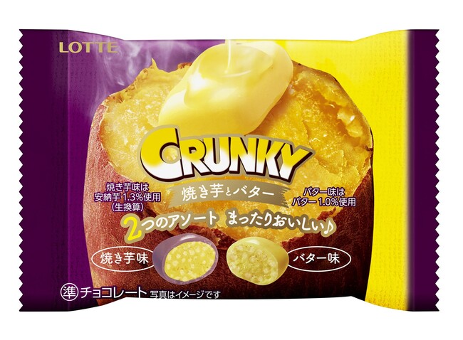 株式会社ロッテは10月18日(火)に、サクサク食感でおなじみの「クランキー」シリーズからひとくちサイズの「クランキーポップジョイ<焼き芋とバター>」を発売いたします。香ばしく焼き上げたお芋の蜜の甘みをイメージした”焼き芋”味のチョコに、程よく塩味のきいた”バター”味のチョコを組み合せ、定番の味わいを再現しました。交互に食べればとまらぬおいしさ♪一袋ぺろりと食べたくなる味わいです。この機会にぜひお試しください。
