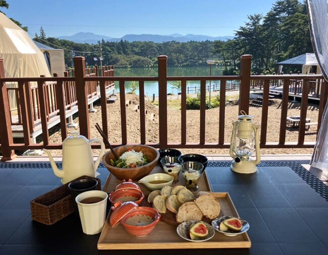 2つのアルプスが一望できる千人塚公園の中に建てられた4つのドーム型テントを公開しました。冷暖房完備のテント内には、ベッドが2台とエキストラベッド(お布団)が2台あり、4名まで宿泊が可能です。グランピング初心者や家族連れの方にも安心の室内に、参加者からは「広々とした快適な空間で、子供も連れていけそう」「中のインテリアもおしゃれで素敵。公園の中にあるのを忘れてしまうくらい、ホテルのようなきれいさだね」などの声があがりました。