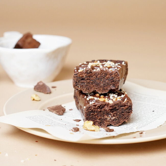 大粒ザラメが入った京ワッフルの生地に、ココアパウダーをたっぷり練り込み、まるでチョコレートブラウニーのようなしっとり&濃厚なワッフル。その上から頬張った瞬間「パキッ」と音が鳴るほど分厚くチョコレートをディップ。細かく砕いたナッツをトッピングし、アクセントのあるフレーバーに仕上がりました。