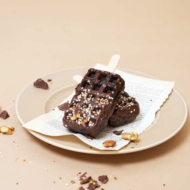 ほろ苦いココア生地のワッフルとチョコレートの相性は抜群。程よい甘さが癖になる限定フレーバーです。コーヒーや紅茶などのドリンクと一緒にお楽しみください。