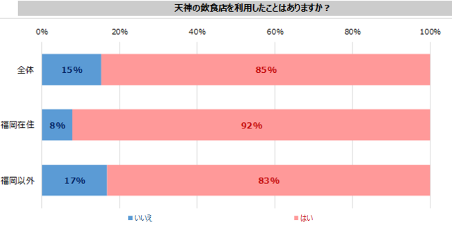福岡の天神に多くの方が好印象を持っており、街並みが好きだと74%の方が答えています。にぎやかで飲食店が充実しているところが魅力とされています。天神の飲食店を利用したことがある方は全体で85%、夜外食の利用は福岡県在住の方が80%、福岡県以外の方が65%でした。夜外食では個店の居酒屋利用が最も多く、県外から訪れた81%がもつ鍋や博多ラーメン、明太子など福岡の特産品や名物を楽しんだようです。