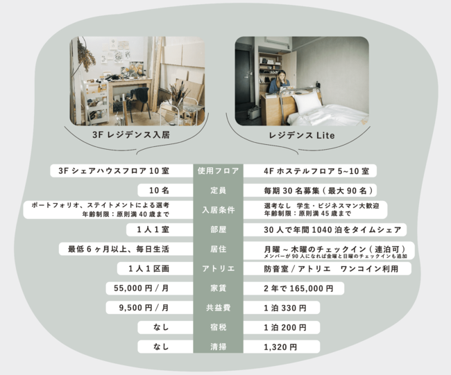 レジデンスliteは当施設のエコノミーシングル客室を月曜~木曜のチェックイン宿泊に限り会員制で格安に提供する定額プランです。会員費165,000円(税込)で2年間、平日の宿泊ルーム料金が無料になります(清掃、水光熱費、宿税は宿泊都度徴収)。さらに滞在中550円(税込)で音楽収録ができる防音室(4時間利用)やペイントができるアトリエ(8時間利用)をオプションとしてご利用いただくことで、幅広いジャンルの制作滞在に対応します。