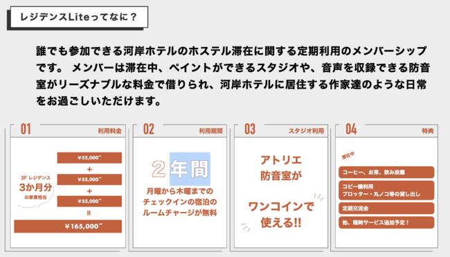 株式会社めい(京都市下京区 代表:扇澤友樹)が運営する河岸ホテル(以下、当施設)では、2022年10月13日(木)より、3ヶ月分の家賃で2年間、 誰でも参加できるスタジオ付きホテルの平日入居「河岸ホテルレジデンスlite(以下、当プラン)」の定額利用メンバーを募集いたします。※「3ヶ月分の家賃」は当施設長期スタジオ付き住居の家賃を基準としています。