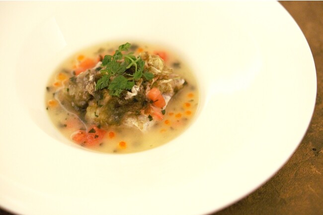 中でも、総料理長の自信作は「日本海で獲れたのどぐろと蟹の昆布蒸し」。この時期特に脂の乗ったのどぐろを熟成させ、さらに旨みを引き出し、蟹や椎茸と一緒に昆布巻きにして蒸しました。身はふっくらジューシーに、のどぐろから出た出汁と昆布や椎茸の旨味が全体にまわり、芳醇な香りが立ち上ります。仕上げにいくらを浮かべたスープは最後の一滴まで飲み干したくなるほど。フレッシュな果実味と酸味をもつボジョレーがのどぐろの味わいをさらに高みに上げてくれます。