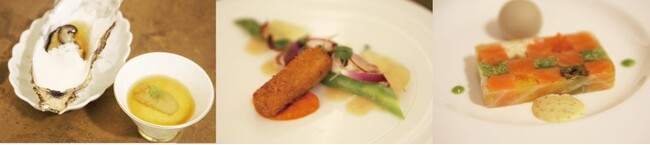 コースの最初に出る「85℃の能登牡蠣 レフォールクリームとキャロットムース」や「オマール海老のリゾットコロッケ 蟹とアスパラガスのサラダ添え」「トラウトサーモンのマリネと野菜のモザイク」は、ボジョレー地区に隣接するマコネ地区のシャルドネ種100%から作られる白ワインの新酒「マコン・ヴィラージュ・プリムール」とのペアリングでお楽しみください。