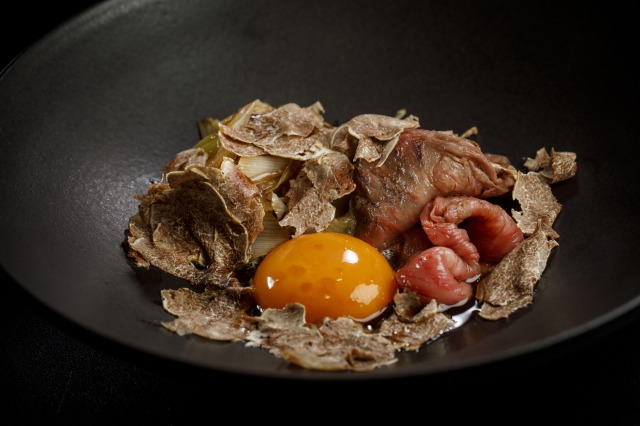 希少部位の但馬玄ロースをすき焼き風にアレンジ!トッピングの白トリュフをお肉で包んで至福の一口をお楽しみください。