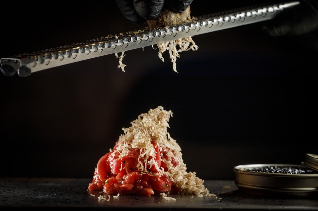 スペシャリテの但馬玄ユッケにフレッシュな白トリュフをスライス