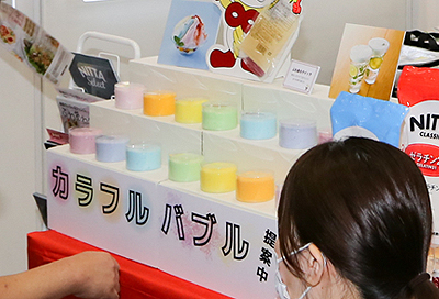 お好みの液体素材と合わせて混ぜるだけでふわふわ泡を作ることができます。 天ぷらのつゆやかき氷のシロップなど一年を通してふわあわ料理をお楽しみいただけます。加熱調理は不要で、出来上がった泡は冷蔵・冷凍保存が可能です。カラフルに色づけした泡は来場者の目に留まりサンプル依頼を多数いただきました。