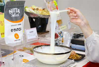 もちっとお餅のようにのびるのに、さっぱりとした口どけ。従来にない食感が特徴です。お餅でもない、プリンでもない新食感の素材で、トルコアイスのように練るとどんどん伸びるので、見た目で差別化ができ、さらにもちもちの新食感をお楽しみいただける素材です。伸びる様子を実演で見ていただき、興味を持っていただきました。