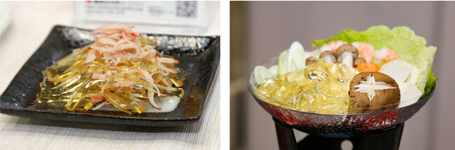 調理法によって多彩な食感を楽しんでいただける“食べコラ”。コラーゲンが手軽に摂れて、高たんぱく・低糖質・脂質ゼロです。すぐに使えて味や色が染み込みやすく温めても溶けないので、サラダ・お鍋・ドリンク・デザートなど様々な料理やデザート等にお使いいただけます。