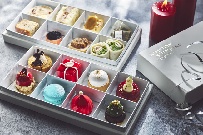 クリスマススイーツ9種とカナッペ6種、ティーサシェ2 つが付いて、ボックスをあければすぐに優雅なティータイムをお楽しみいただけます。