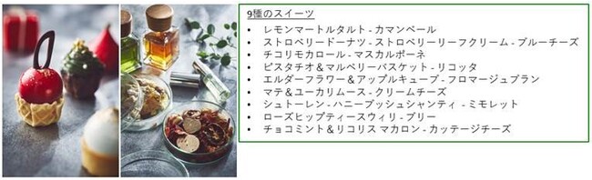ディストリクト ブラッスリー・バー・ラウンジがフェスティブシーズンにお届けする、ハーブ&チーズをテーマに香りと風味を追求した9種のスイーツをアフタヌーンティーご提供いたします。レモンマートルとカマンベールのタルトや、リンゴのコンポートが入ったフロマージュブランとエルダーフラワーのムースなどそれぞれが異なるハーブとチーズで構成されています。ツリーやプレゼントボックス、スノーマンといったカラフルでキュートに煌めくクリスマスモチーフが、2022年を締めくくる大切なイベントを華やかに彩ります。メニューに合わせて調香したフレグランスペアリング体験もご用意しています。スイーツとフレグランスの香りのレイヤードをお愉しみください。
