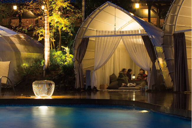 「THE LIVING GARDEN」のプールサイドに佇む、貸切タイプの「水辺のガゼボ」では、屋外でもあたたかくお過ごしいただけるよう、掘りごたつやブランケットをご用意。本を読んだり、ピクニックを愉しんだり、プライベートな空間でグランピング気分を味わえます。