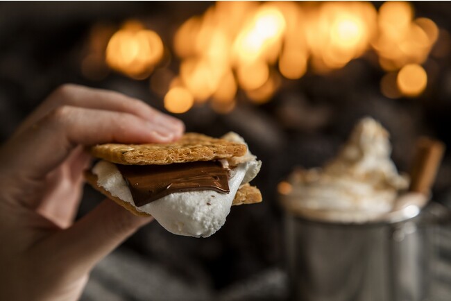 ゆらめく炎を見つめていると、不思議と心が安らいでゆきます。「THE LIVING GARDEN」内にある「焚火のリビング」では、焚き火を囲みながら味わうアメリカ伝統のキャンプファイヤーで人気のデザート「スモア」作りをお楽しみいただけます。