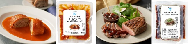 左:ベーコン巻きロールキャベツ トマトと野菜のソース 605円(税込)