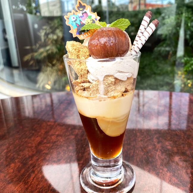手作りの紅茶のゼリーとマロンアイスのハーモニー、わらび餅のアクセントが効いた、秋らしいデザートです。