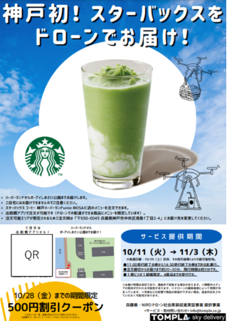 TOMPLA株式会社(新潟県新潟市)は、兵庫県・(公財)新産業創造研究機構(NIRO)の令和4年度ドローン社会実装促進実証事業として、株式会社出前館(東京都渋谷区)、株式会社吉富運輸(兵庫県神戸市)、日本コンピューターネット株式会社(大阪府大阪市)、スターバックス コーヒー ジャパン株式会社(東京都品川区)、神戸学院大学(兵庫県神戸市)と協働し、2022年10月11日から11月3日まで、 神戸市ハーバーランドとポートアイランド間で、出前館アプリを利用したフードデリバリーのテストマーケティングを行います※。※10月15日(土)のフライト時に、機体に不具合が生じたため、継続しての運行ができなくなったことから、実証実験を一時中止とさせていただきます。(2022年10月17日(月)追記)