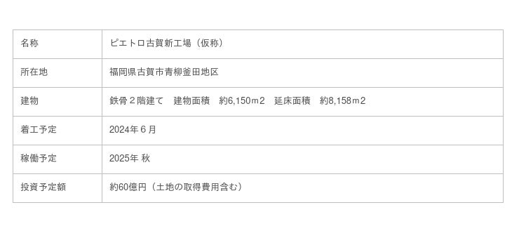 株式会社ピエトロ(本社:福岡市中央区 代表取締役社長 高橋泰行)は、2021年3月に福岡県古賀市と締結した立地協定の通り、同市 青柳釜田地区に新しい製造工場を建設いたします。同年10月に適時開示した設計・施工業者 株式会社フジタと新工場の企画・設計を進め、建物仕様、生産設備など計画の概要がまとまりましたので、下記の通り発表いたします。詳細はリリース本文をご確認ください。