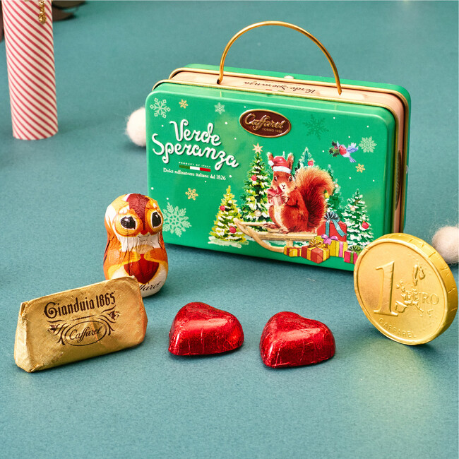 内容:美しいモミの木をバックに、プレゼントを運ぶハイイロリスが描かれたミニサイズのトランク缶。ジャンドゥーヤをはじめ、可愛らしいリスのホイルチョコレートや幸運の象徴ともいわれる、ユーロコインのホイルチョコレートなど全5粒アソート。片手におさまるサイズ感です。