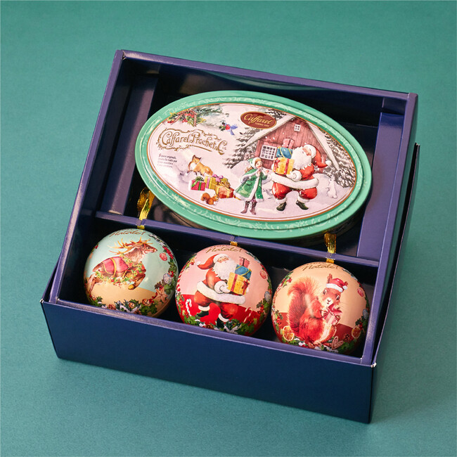 内容:人気のオーナメント缶3種類を、クリスマスカラーの緑のボックスにセットしました。オーナメント缶はツリーの飾りにもなるので、クリスマス気分を高める、特別感あふれる商品です。
