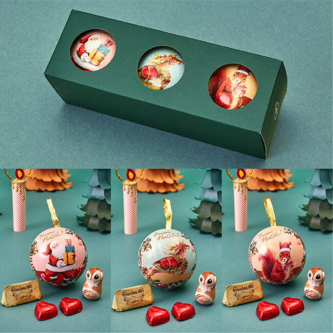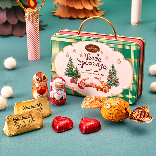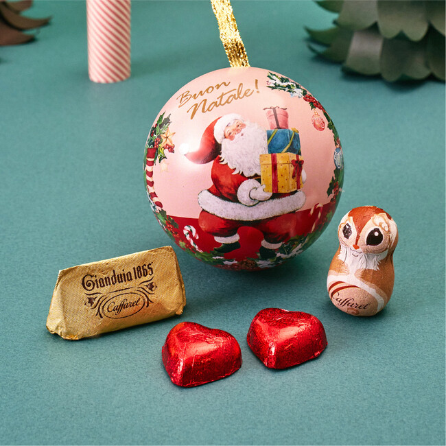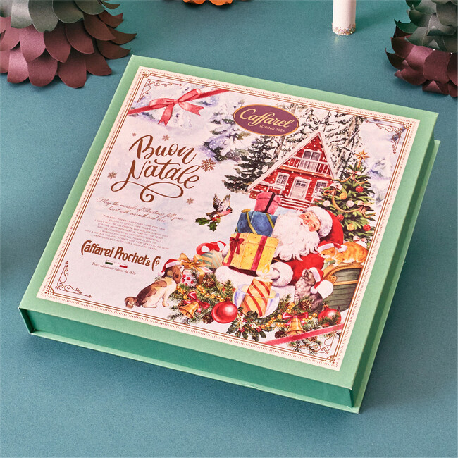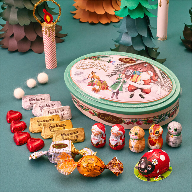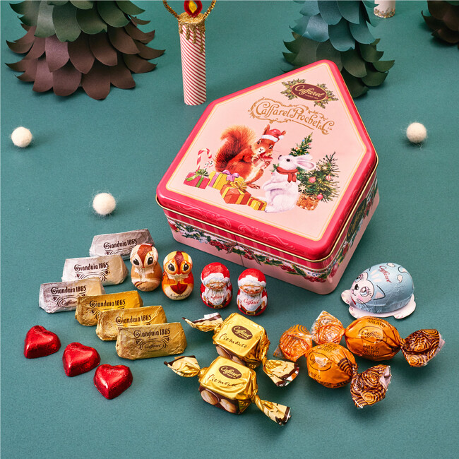 内容:雪山のロッジにプレゼントを届けるサンタクロースが描かれたオーバル型の缶。ヨーロッパコマドリやキツネ、ハイイロリスなどクリスマスを象徴する動物たちも勢ぞろいし、大変華やかなデザインとなっています。定番のジャンドゥーヤをはじめ、サンタクロースやリス、ネコのホイルチョコレート、イタリアを代表するチョコレートであるクレミノなど全18粒アソート。クリスマスのギフトにおすすめです。