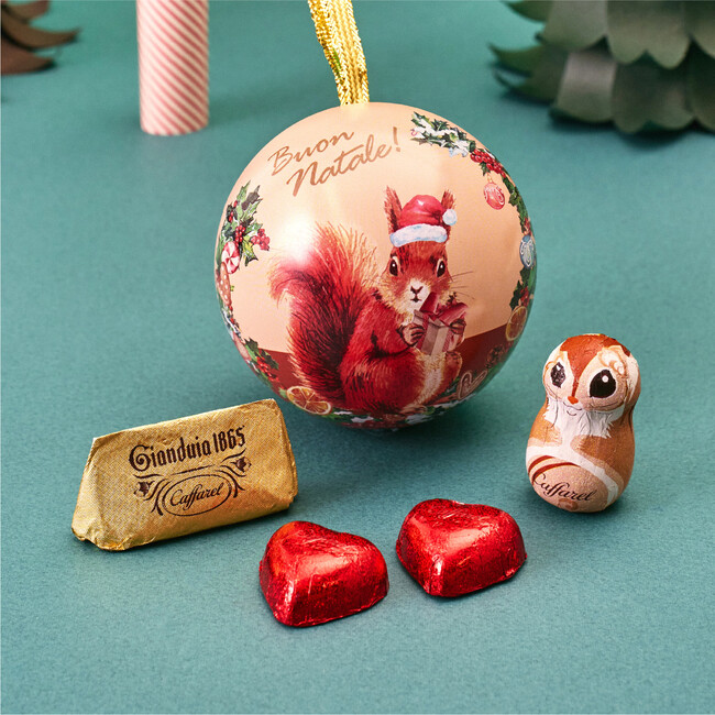内容:クリスマスに登場するキャラクターとして定番のハイイロリスが描かれたオーナメント缶。つぶらな瞳のリスのホイルチョコレートをはじめ、定番のジャンドゥーヤなど全4粒のチョコレートをアソート。