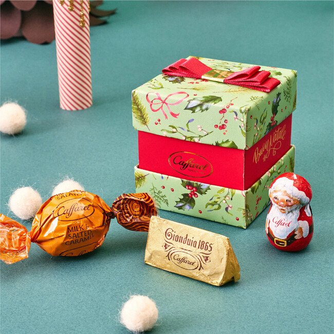内容:「小さなクリスマス」という意味のピッコロ・ナターレ。セイヨウヒイラギや松の葉などクリスマスを彩る植物が描かれた小さなボックスに、サンタクロースのホイルチョコレート、ジャンドゥーヤ、塩キャラメルチップが入ったソルテッドキャラメルを全3粒アソート。クリスマスのプチギフトにおすすめです。