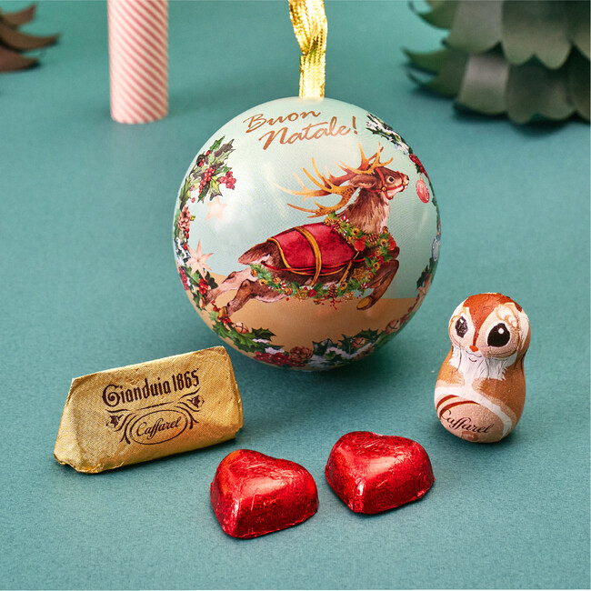 内容:クリスマスの空を翔けるトナカイが描かれたオーナメント缶に、カファレルの代名詞であるジャンドゥーヤをはじめ、ホイルの裏に3か国語で愛の言葉がつづられたミニハートなど全4粒のチョコレートをアソート。