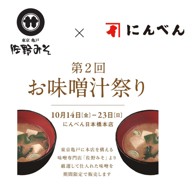 株式会社にんべん(東京都中央区、代表取締役社長 高津伊兵衛)は、東京・亀戸に本店を構える味噌専門店「佐野みそ」との共同企画「第2回お味噌汁祭り」を、COREDO室町1の「にんべん 日本橋本店」にて、10月14日(金)から10月23日(日)の期間で開催いたします。
