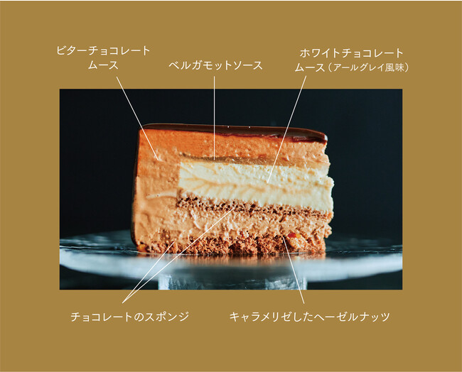 1層目は空気を含んだ軽い口当たりのスポンジ生地に、キャラメリゼしたヘーゼルナッツを食感に重ねました。3層目はビター チョコレートの滑らかなムースです。4層目にスポンジ、アール グレイを浸し香りをうつしたホワイトチョコレートのムース、上に は酸味の効いた華やかなベルガモットのソースを重ねていま す。7層目にビターチョコレートムース、最後に艶やかな層で全体を包みました。 エレガントなベルガモットとカカオのマリアージュをご堪能ください。
