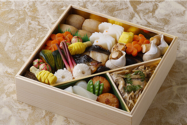 壱の重には、松山から取り寄せた天然の鯛をはじめ、天然伊勢海老や鮑、いくらなど贅沢な縁起物を、弐の重は、しっかりと時間をかけて丁寧に炊き上げる丹波の黒豆をはじめ職人たちが心を込めて作り上げる伝統的なおせち料理を惜しみなく詰め合わせ、フレンチレストラン「ビクターズ」の前菜を彩り華やかに散りばめました。参の重には、素材の魅力を引き出すために一つひとつ丁寧な手仕事で炊き上げる煮物と焼き物が美しく並びます。新しい年の幕開けを祝うのにふさわしい、繊細な匠の技を感じていただけるおせち三段重です。