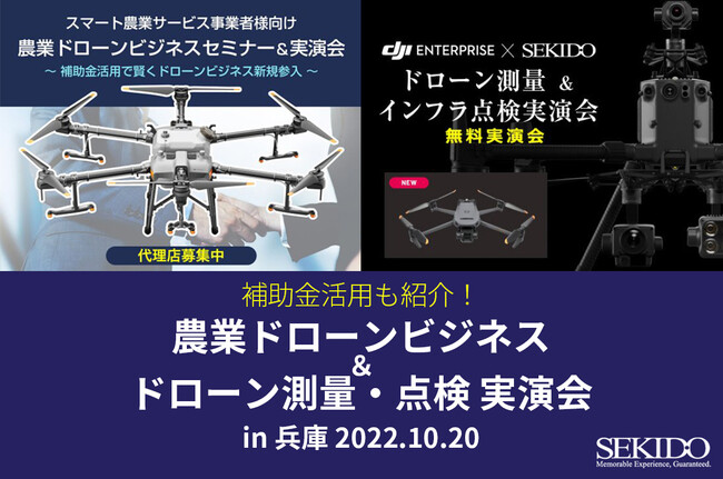 日本初のDJI正規販売代理店である株式会社セキド(本社:東京都港区、代表取締役:大下貴之)では、株式会社てんと線(本社:兵庫県豊岡市)と共同で、2022年10月20日(木)10時より兵庫県豊岡市にて、業務の効率化/省力化のため導入が進む業務用ドローンについてわかりやすくお伝えする2つの無料セミナー/実演会を開催いたします。10時から開催の「農業用ドローン ビジネスセミナー&実演会」では、農業向け事業を手掛ける皆さまに最新の状況や最先端ソリューションの有効活用方法を実演を交えてご紹介いたします。13時30分から開催の「ドローン測量&インフラ点検実演会」では、すでに多くの現場に導入されるDJIの産業用ドローンと関連製品によるデモと取得したデータをご覧いただきます。これから活用できる各種補助金についてもご紹介しますので、ビジネスへのドローン導入をご検討中の方や不安、疑問をお持ちの方、賢くドローンを導入されたい方のご参加をお待ちしております。