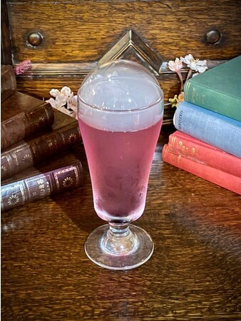 魔法がかかる瞬間をイメージした煙のドリンク。バタフライピーシロップを沈めたサイダーに、花吹雪をイメージしたさくらとエルダーフラワーのシロップを注ぎ、煙を閉じ込めた食用シャボン玉を乗せた不思議なカクテル仕立てに。