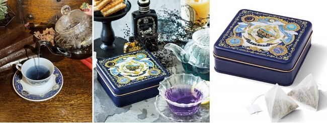 ウェブで販売中の魔法部お茶「マジカルカラーティー」を、同じく魔法部のアイテム「ティータイムのためのカップ&ソーサー」で味わうドリンクメニューです。レモンを入れると夜明けの空のように青いお茶の色が変わる様子で、見た目の楽しさも味わえます。こぼれた星のかけらをイメージした金平糖を添えて。(スライスレモン、金平糖が添えられ提供されます)