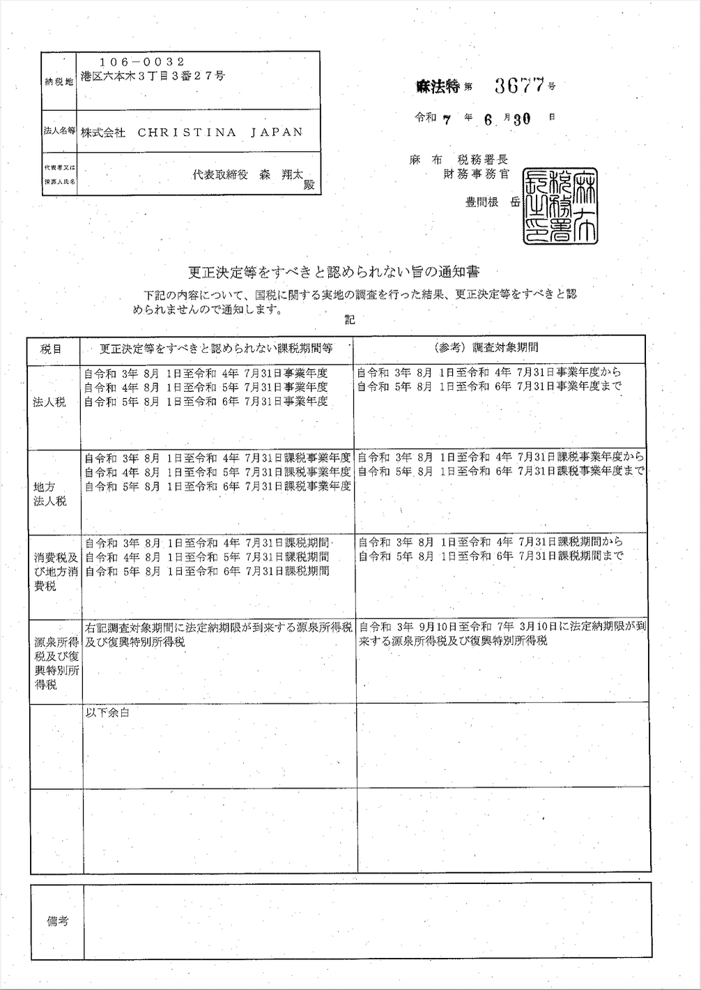 株式会社CHRISTINA JAPAN (本社:東京都品川区、代表取締役:森 翔太) は、2025年7月に税務署より正式に「申告是認通知書」を受領いたしました。併せて、株式会社INFINIX HOLDINGS (本社:東京都品川区、代表取締役:森 翔太)は、2025年9月に最新の決算を無事に完了いたしましたことをご報告いたします。
