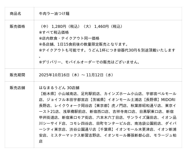 また、本コラボレーションは相互開催となり、同期間中「なぜ蕎麦にラー油を入れるのか。」の店舗でも、共同開発コラボ麺を使用した、はなまるうどんとは異なる限定コラボメニューが販売されます。