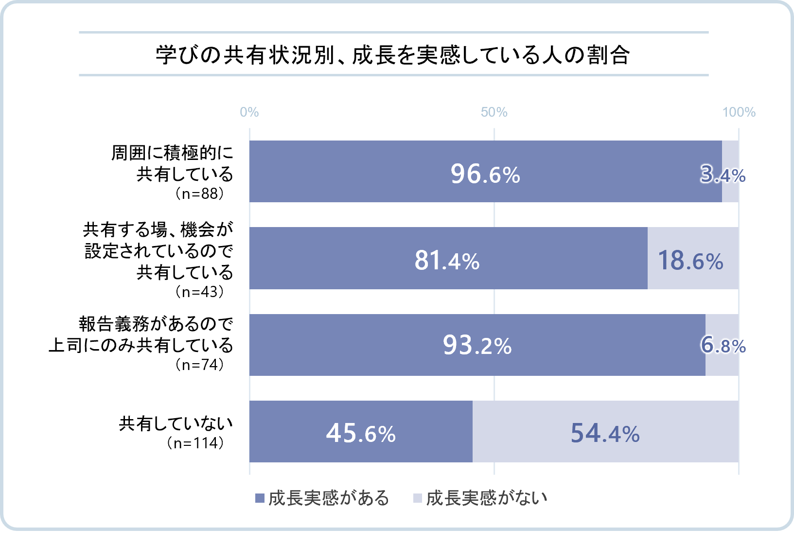さらに義務的ではなく、学びを積極的に周囲に共有する層の方が、成長実感が高まる傾向も見られました。積極的に共有する層の成長を実感する割合が96.6%に対し、共有しない層が45.6%と半数以下となる結果となりました。