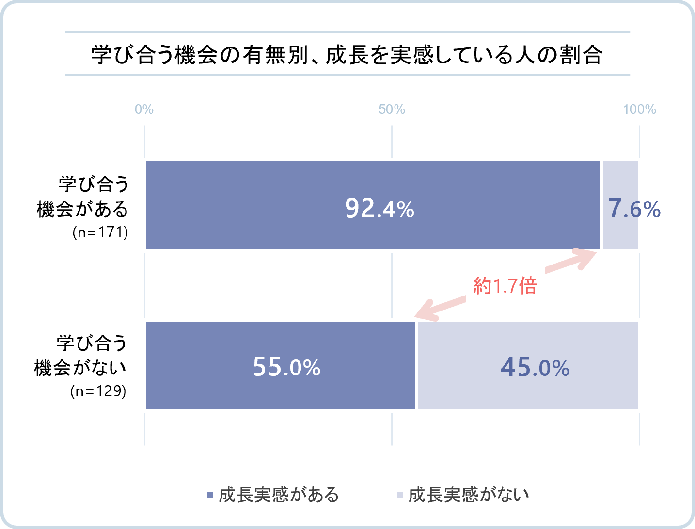 組織に学び合いの機会がある場合、成長を実感している層は92.4%に上りました。一方で、組織に学び合いの機会がない場合は55.0%にとどまり、その差は約1.7倍となりました。