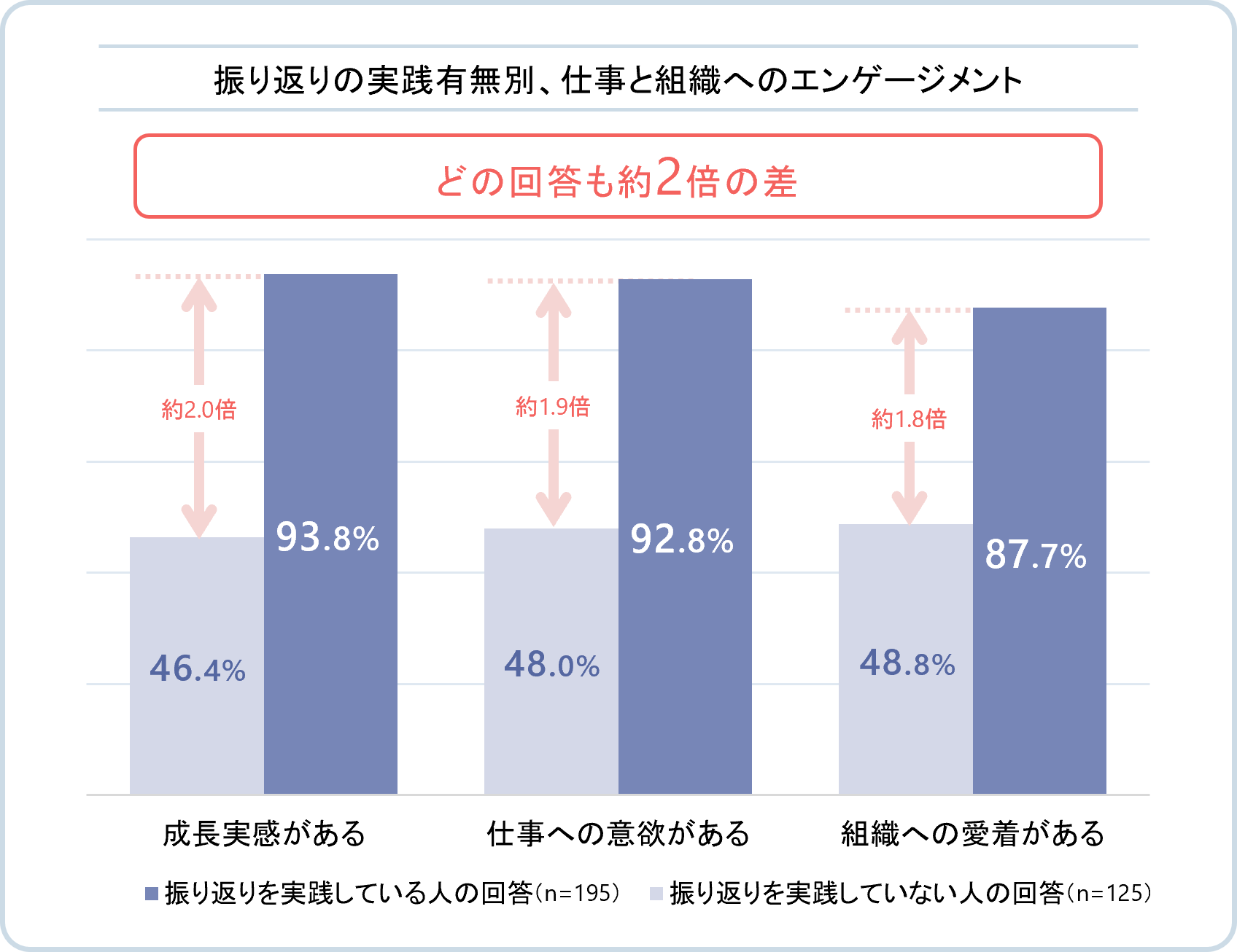 振り返りを実践する層は、実践しない層よりも、「成長実感」「仕事への意欲」「組織への愛着」すべての項目が高い傾向にあり、その差は約2倍に上ることが分かりました。