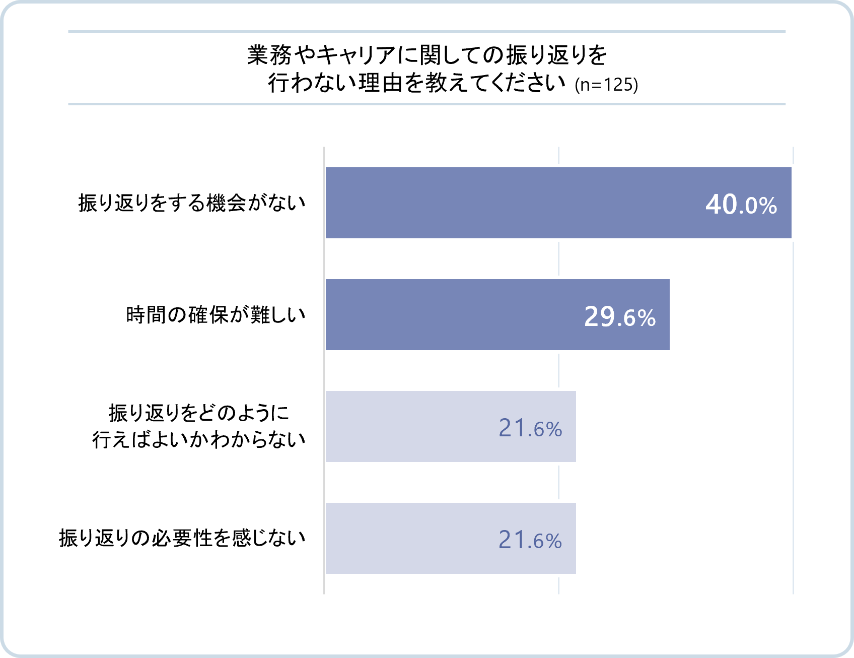 所属する組織に振り返りの仕組みがある場合、振り返りを実践する層は90.3%に上りました。一方で、定期的な振り返りを行っていない層は、「機会がない(40.0%)」「時間の確保が難しい(29.6%)」を上位理由として、振り返りを行えていません。