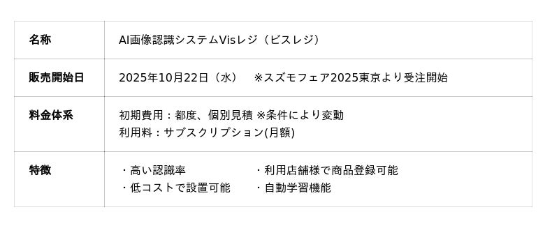 鈴茂器工株式会社(本社:東京都中野区、代表取締役社長:谷口徹 以下、鈴茂器工)は、AIを搭載したAI画像認識システム「Visレジ(ビスレジ)」の販売を開始することをお知らせします。