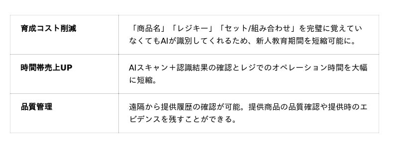 Visレジ導入後、画像認識からメニューが画面に反映されるまでの時間は約2~3秒に短縮。この大幅な時間短縮により、スタッフからは「サービススピードの向上と作業負荷の軽減につながる」と評価されています。
