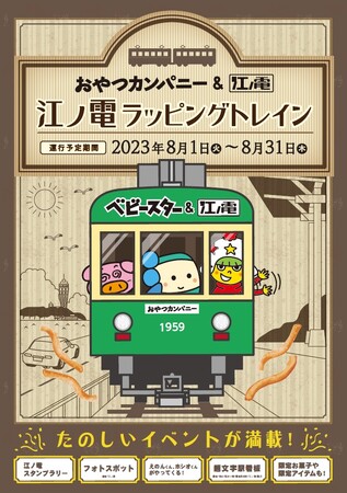 株式会社おやつカンパニー(所在地:三重県津市 代表取締役社長:手島文雄)は、日常の中で忘れがちな、あの頃のワクワクする気持ちをお届けしたいとの想いから、「#こんなとこにもベビースター」とつぶやきたくなる、おやつの常識にとらわれないベビースターならではのオモシロいコラボ企画をいろいろな業界・いろいろな場所・いろいろなシーンで展開しています。65年目を迎えたベビースターの記念すべきコラボ第1弾は、駅名にもベビースター!?と写真を撮りたくなるべビースターの江ノ電ジャック企画。湘南藤沢と古都鎌倉をむすぶ「江ノ電」と発売65年目のベビースターがタッグを組んで、昭和の雰囲気いっぱいのラッピングトレインを2023年8月1日(火)~8月31日(木)の期間限定で運行します。さらに、ベビースターを使った麺文字で表現された駅名看板にも注目!今年の夏の思い出づくりに、江ノ電に乗った人はもちろん、沿線で見かけたすべての方に驚きとワクワクをお届けします。