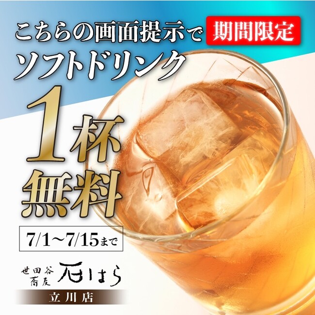 ご注文時にスマホでサービス画面を提示されたお客様限定で、ソフトドリンク1杯をサービスさせていただきます。